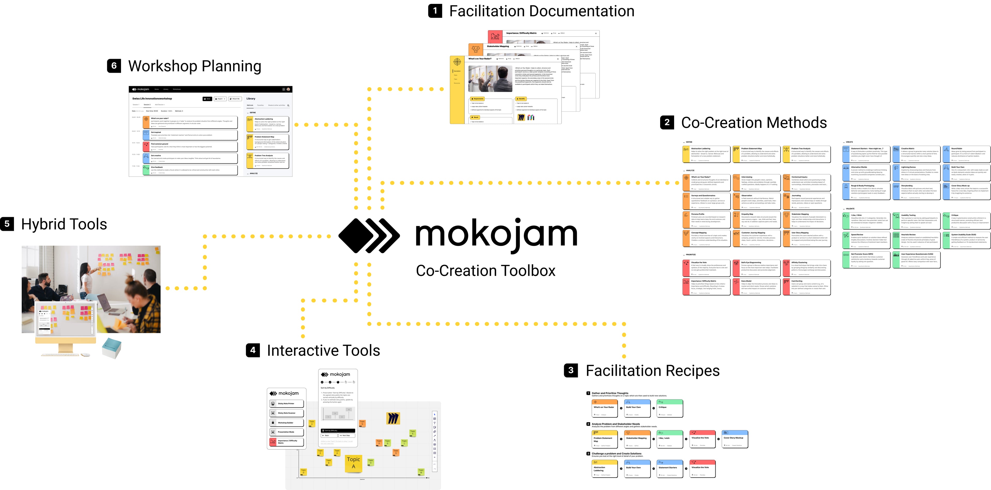 Create engaging workshops by using our recipes or start from scratch by just drag & drop your favorite methods into the agenda.You will also get a quick guide with the most important steps helping you to facilitate each method. Our Workshop Planer creates a timeline for you and calculates the total duration. Multi-day workshops like design sprints are supported as well. Finally mokojam automatically creates all the templates for your workshop in Miro, Mural and Co.